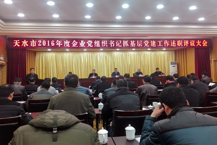 1月16日,天水市企業(yè)工委組織召開(kāi)了“天水市2016年度企業(yè)黨組織書(shū)記抓基層黨建工作述職大會(huì)”,市企業(yè)工委下屬企業(yè)黨組書(shū)記、黨辦主任參加會(huì)議并進(jìn)行工作評(píng)議。公司黨委委員、副總經(jīng)理郭武奎參加了述職大會(huì)。 會(huì)上,華天電子、國(guó)網(wǎng)供電公司、長(zhǎng)城開(kāi)關(guān)廠有限公司、市煙草專(zhuān)賣(mài)機(jī)關(guān)局機(jī)關(guān)黨委等12家企業(yè)黨委書(shū)記對(duì)全年企業(yè)抓黨建工作經(jīng)驗(yàn)和工作履職情況進(jìn)行了總結(jié)及述職匯報(bào)。
